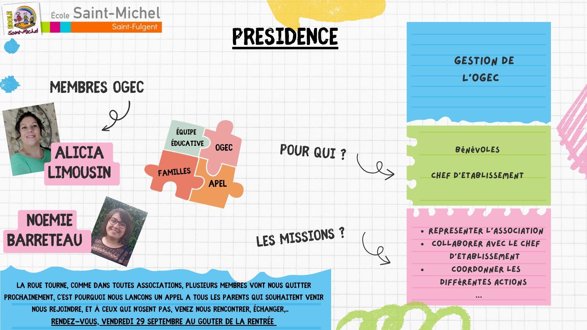 Le chef d’établissement et les membres des associations APEL et OGEC sont acteurs, dans le relationnel quotidien avec les familles, de la valorisation des actions, des missions au bénéfice de l’accueil de nouveaux bénévoles.